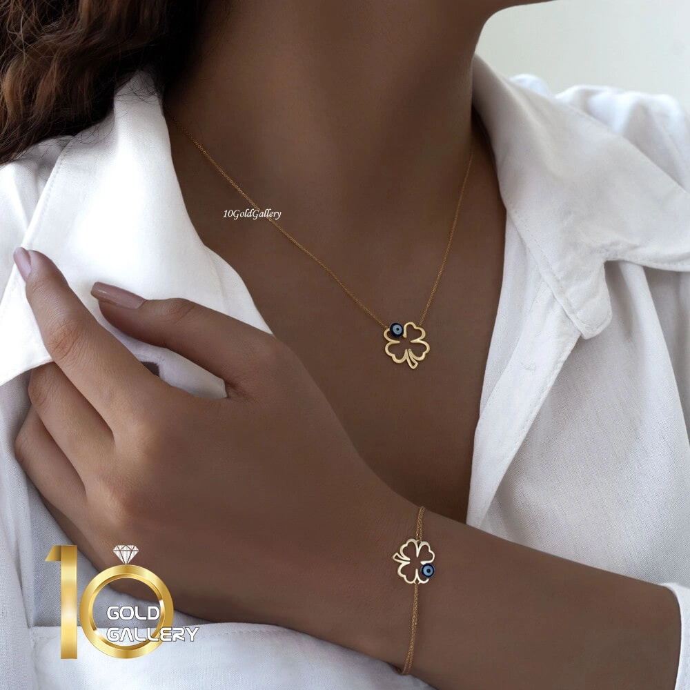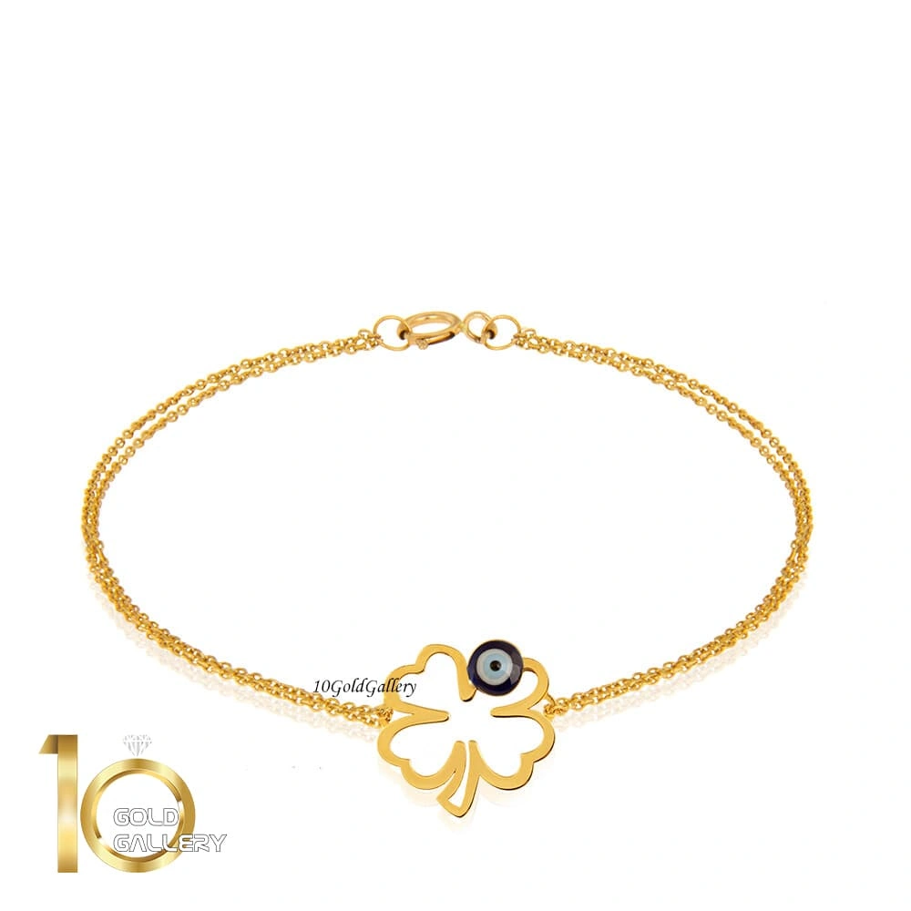 دستبند طلا طرح شبدر با چشم نظر میناکاری