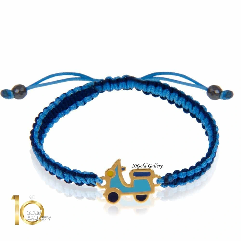 دستبند بافت کودک با پلاک طلا طرح موتورسیکلت میناکاری