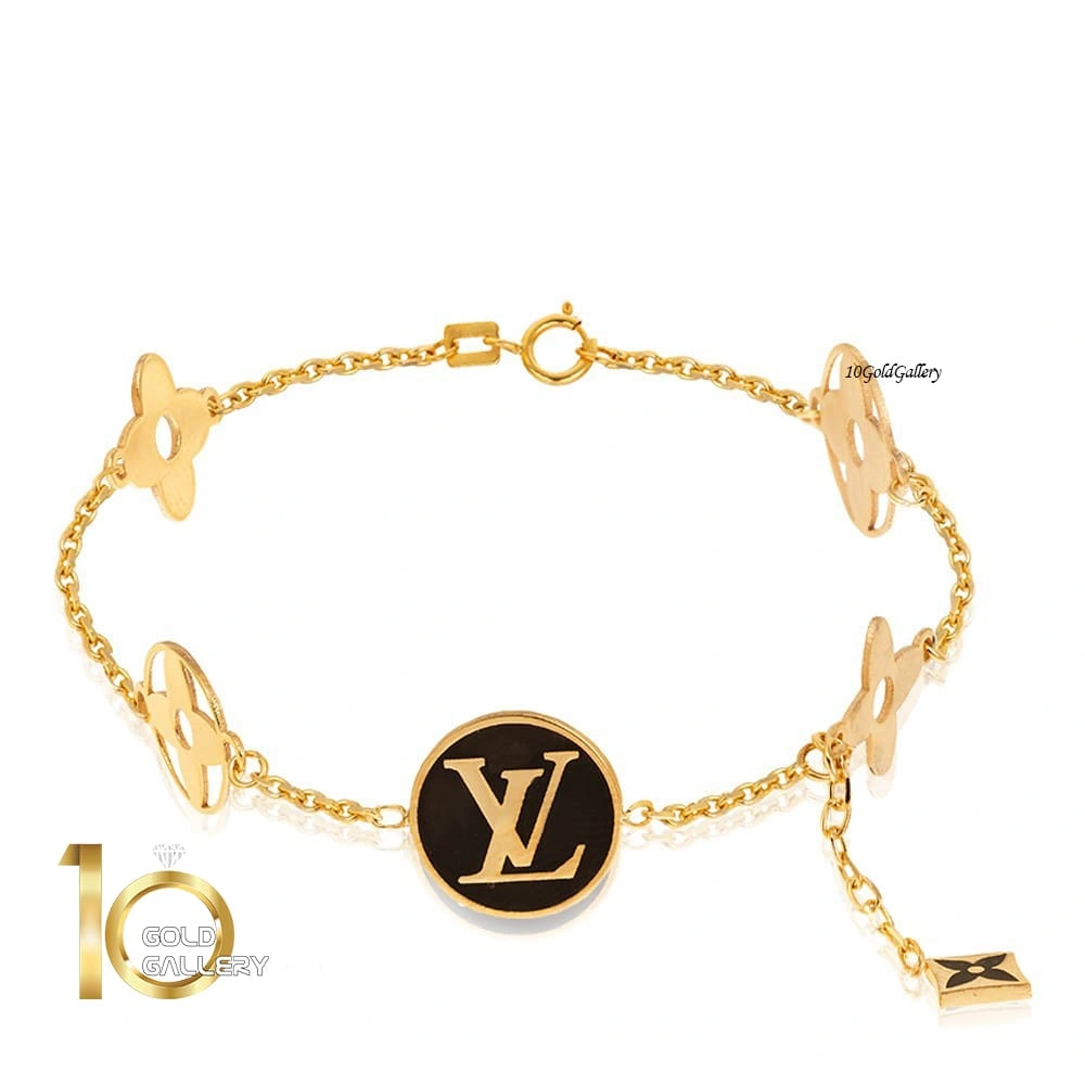 دستبند دارای پنج پلاک و یک آویز است. دو تا از پلاک ها زمینه مشکی میناکاری شده دارد.