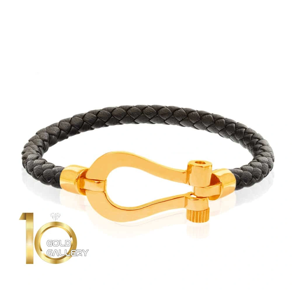 دستبند چرم مردانه با پلاک طلا طرح فرد (سایز بزرگ)