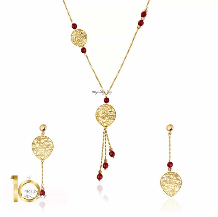 این نیم ست طلا زیبا طراحی و تولید گالری 10گلد می باشد. سنگ های استفاده شده در این نیم ست طبیعی بوده و در کنار طلا تضاد زیبایی را ایجاد کرده که توجه خاص و عام را به خود جلب میکند. این نیم ست هدیه ی مناسبی برای خانم های جوان و به ویژه نوعروسان می باشد.