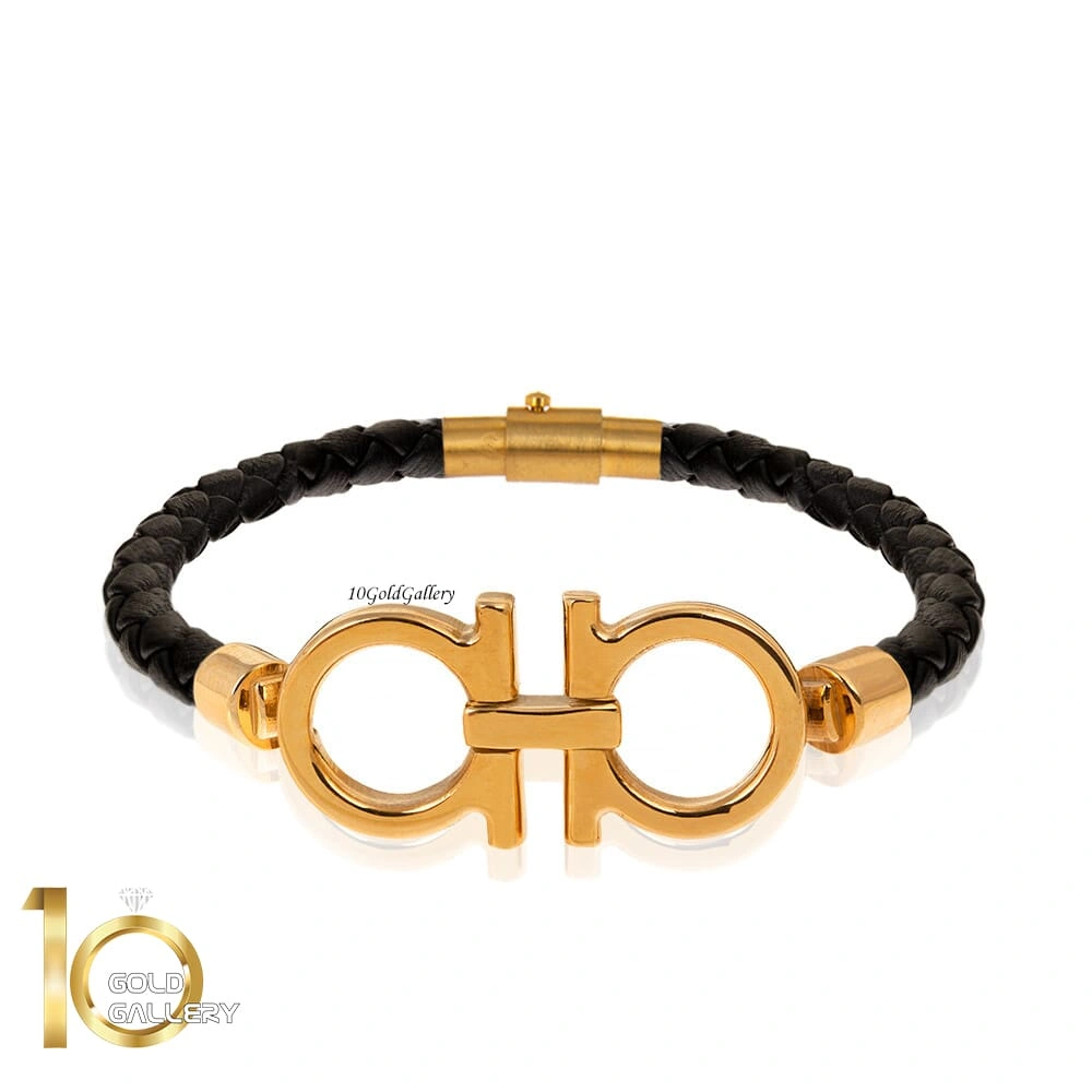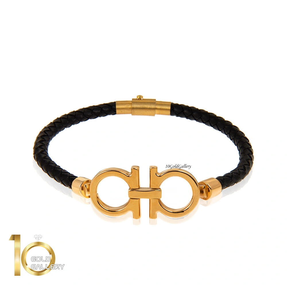 دستبند چرم با پلاک طلا طرح فراگامو