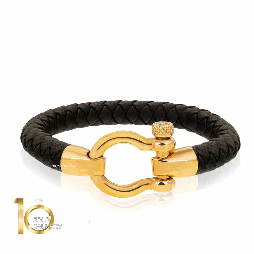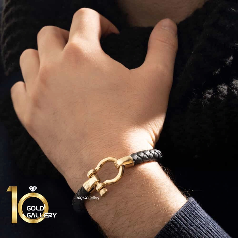 دستبند چرم مردانه با پلاک طلا طرح لنگر کد MB147