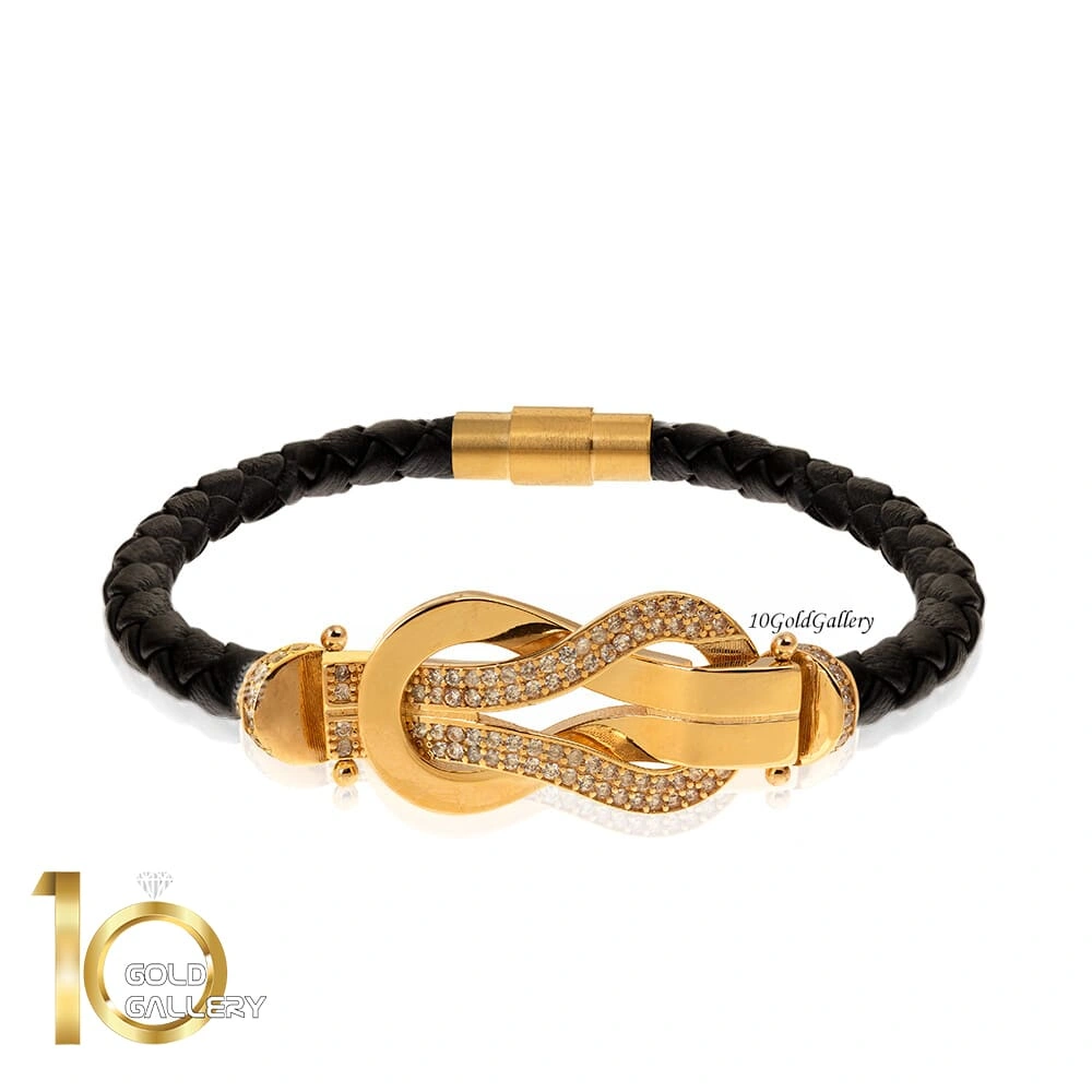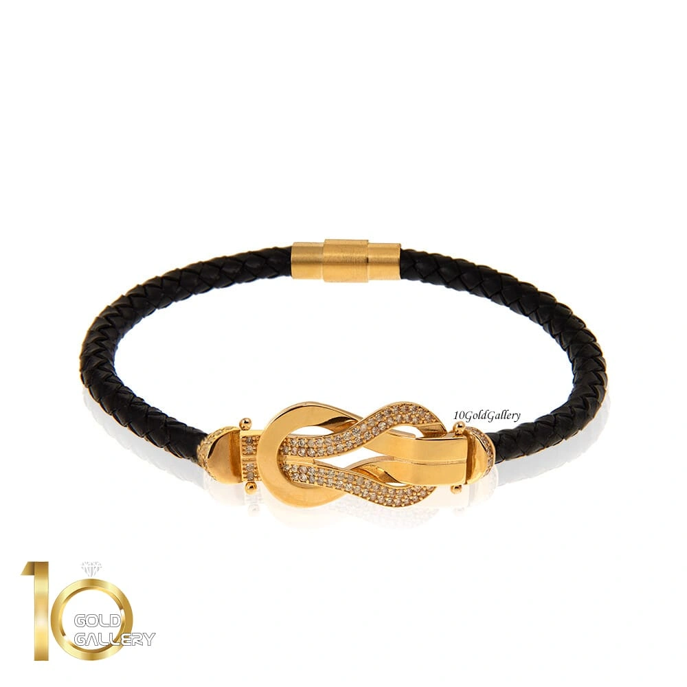 دستبند چرم زنانه با پلاک طلا طرح فرد نگین دار