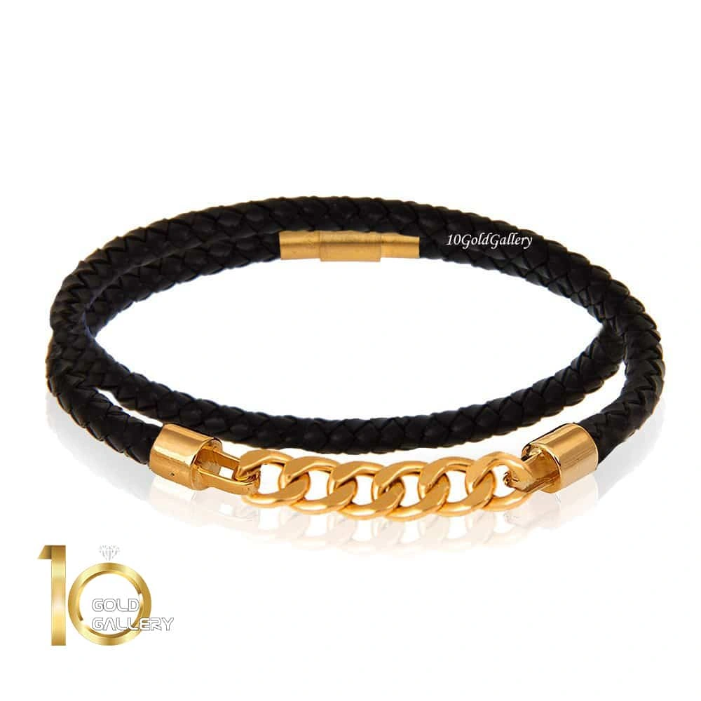 دستبند چرم مردانه با پلاک طلا طرح زنجیر کارتیه (کارتیر)