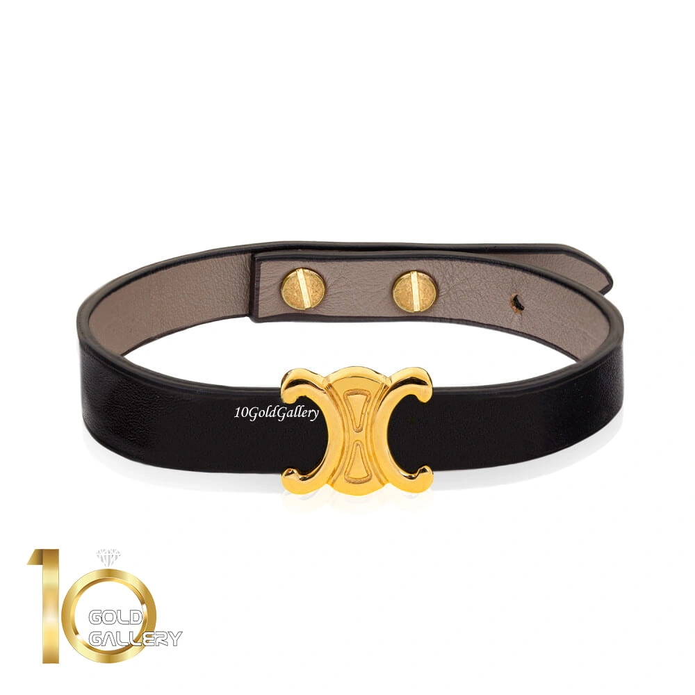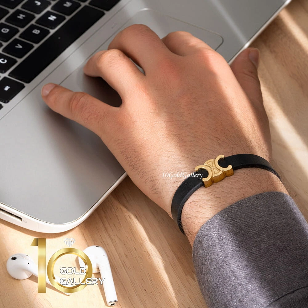 دستبند چرم مردانه با پلاک طلا طرح زنجیر کارتیه (کارتیر)