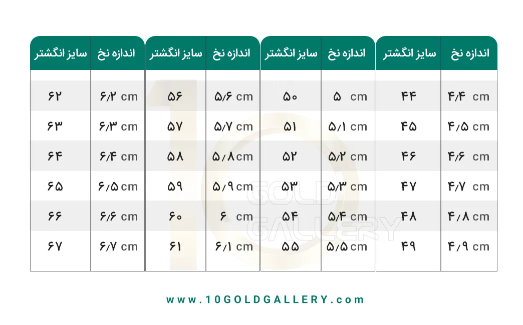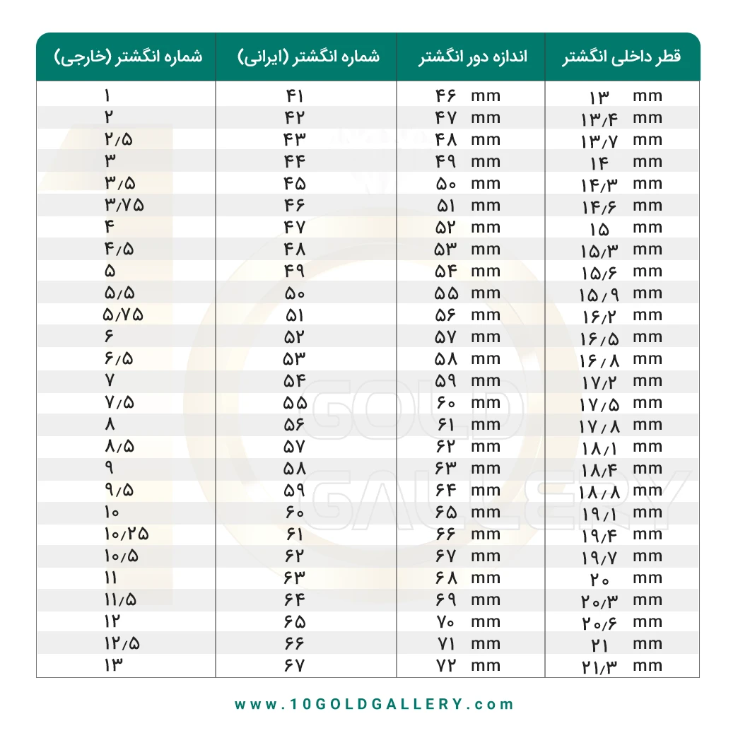 بهترین روش برای اندازه گیری سایز انگشتر به 2 صورت زیر است:1-برای تعیین سایز انگشتر، شما می توانید از یک نوار و یا یک قطعه کوچک از رشته نخ استفاده کنید. هنگامی که نخ را دور انگشت خود در محل قرارگیری انگشتر گرفتید و یک دایره کامل شد، یک علامت روی آن بزنید و سپس با خط کش اندازه گیری کرده و عدد به دست آمده را با مقادیر نمودار زیرمقایسه کنید و سایز دقیق انگشتر خود را بیابید.2-انگشتری که برایتان مناسب است را در نظر بگیرید و قطر داخلی آن را با کولیس یا خط کش اندازه بگیرید و سپس با کمک جدول زیر سایز انگشتر خود را مشخص کنید.برای کسب اطلاعات بیشتر در رابطه با چگونگی انتخاب سایز انگشتر روی لینک روبرو کلیک کنید : مقاله راهنمای سایز انگشتر